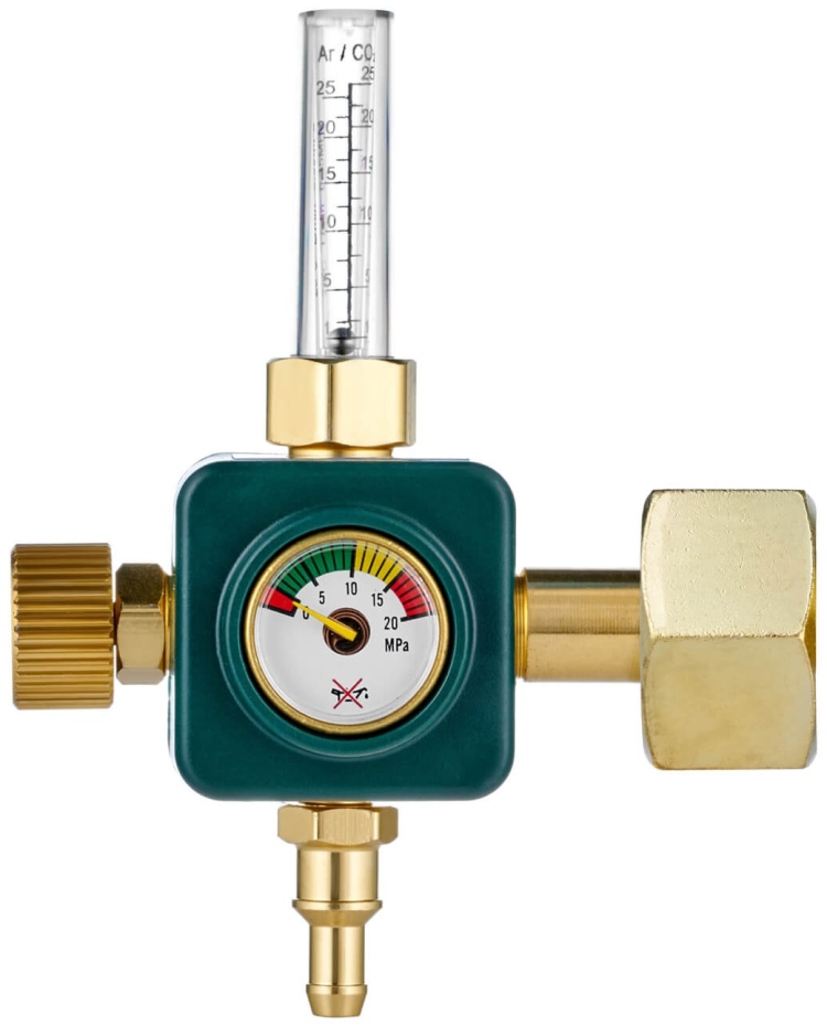 Колба ротаметра изготовлена из прочного пластика, которая имеет две шкалы Ar/CO2. На регулятор установлен эргономичный винт из металлопластика.