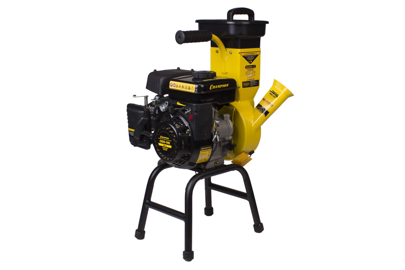 При необходимости протолкнуть материал внутрь воронки дробилки пользуйтесь толкателем, поставляемым в комплекте с устройством, слегка надавливая им на измельчаемый материал. Бензиновый измельчитель CHAMPION SC2818 установлен на металлическую опору, которая имеет четыре ножки, что обеспечивает устойчивость и безопасность во время эксплуатации. Для удаления застрявших материалов из воронки измельчителя в комплект поставки входит специальный крючок.