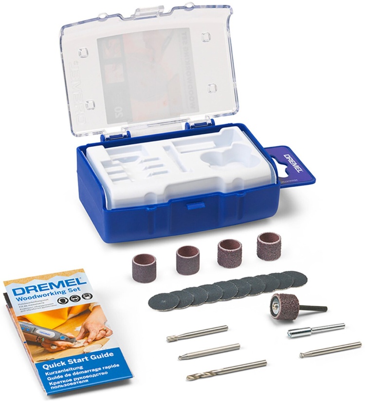 В комплекте есть резцы, шлифовальные круги и ленты, держатели и сверло. Набор поставляется в индивидуальной упаковке.