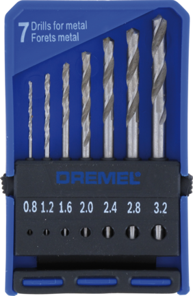 Набор сверл Dremel (628) включает в себя 7 сверл по дереву или мягким металлам. Диаметром 0,8 / 1,2 / 1,6 / 2,0 / 2,4 / 2,8 и 3,2 мм. Необходимы универсальные патроны Dremel 4486. Не совместим с Dremel 4200.