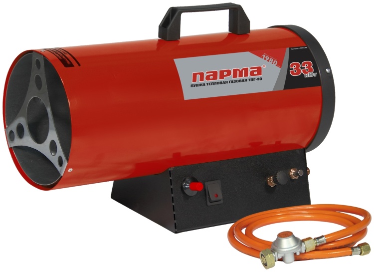 Газовая пушка Парма ТПГ-30 – воздухонагреватель прямого нагрева, работающий на газовом топливе. Топливо необходимо для получения горячей атмосферы в камере сгорания, а электроэнергия, подводимая к устройству, необходима для питания вентилятора, нагнетающего воздух, и для функционирования автоматики. Газовая пушка является простой и надежной конструкцией без дымохода, но горячий воздух и продукты сгорания из устройства поступают в помещение.