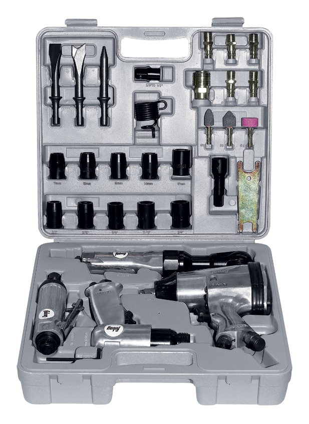 В комплект набора входят: пневмодолото, 3 зубила 120 мм с круглым хвостовиком, пневмогайковерт, 10 головок 1/2", 1 угловой пневмогайковерт, пневмошлифмашина, 3 шлифкамня 6 мм, 1 ключ шестигранный 6 мм, 1 разъем рапид муфта, 2 гаечных ключа, 1 возвратная пружина, 6 разъемов рапид штуцер, 1 удлинитель 1/2" на 75", 1 масленка, 1 переходник 3/8" на 1/2"...