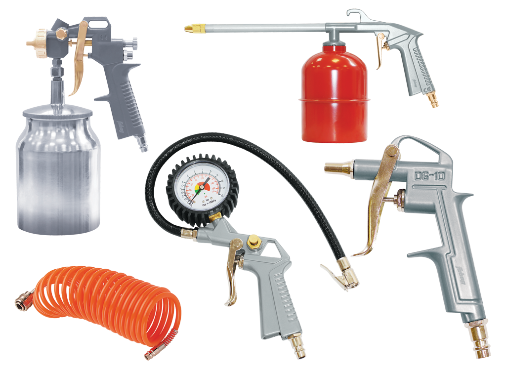 В комплект набора входят: краскораспылитель с нижним бачком объемом 1,0 л, пневмопистолет для вязких жидкостей с бачком 0,85 л, пневмопистолет для продувки, пневмопистолет для накачки шин с манометром, спиральный шланг длиной 5 м...