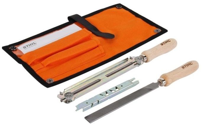Состоит из зажимных державок с круглым напильником , плоским напильником и калибра в прочном футляре.