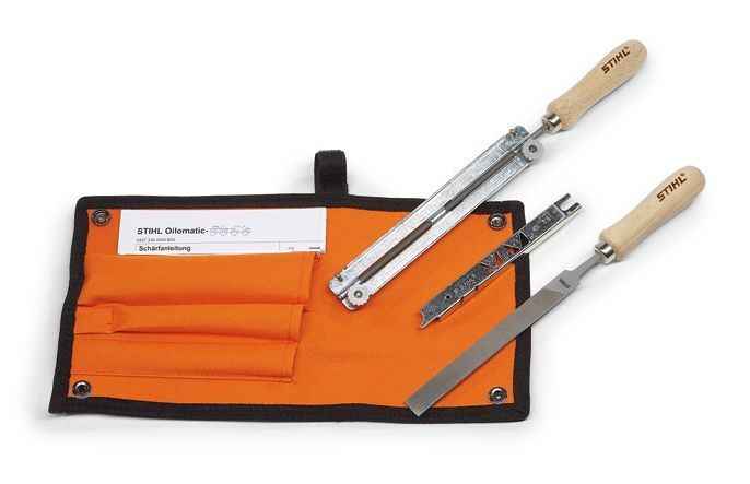 Состоит из зажимных державок с круглым напильником , плоским напильником и калибра в прочном футляре.