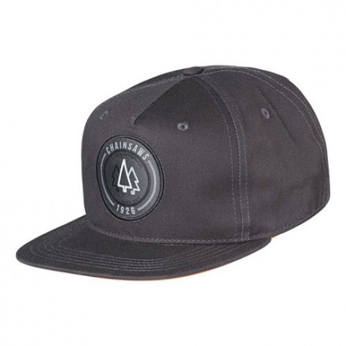 Цвет темно-серый, 100 % хлопок, прямой козырек с нижней стороны оранжевого цвета, эмблема «CHAINSAWS», регулировка размера.
