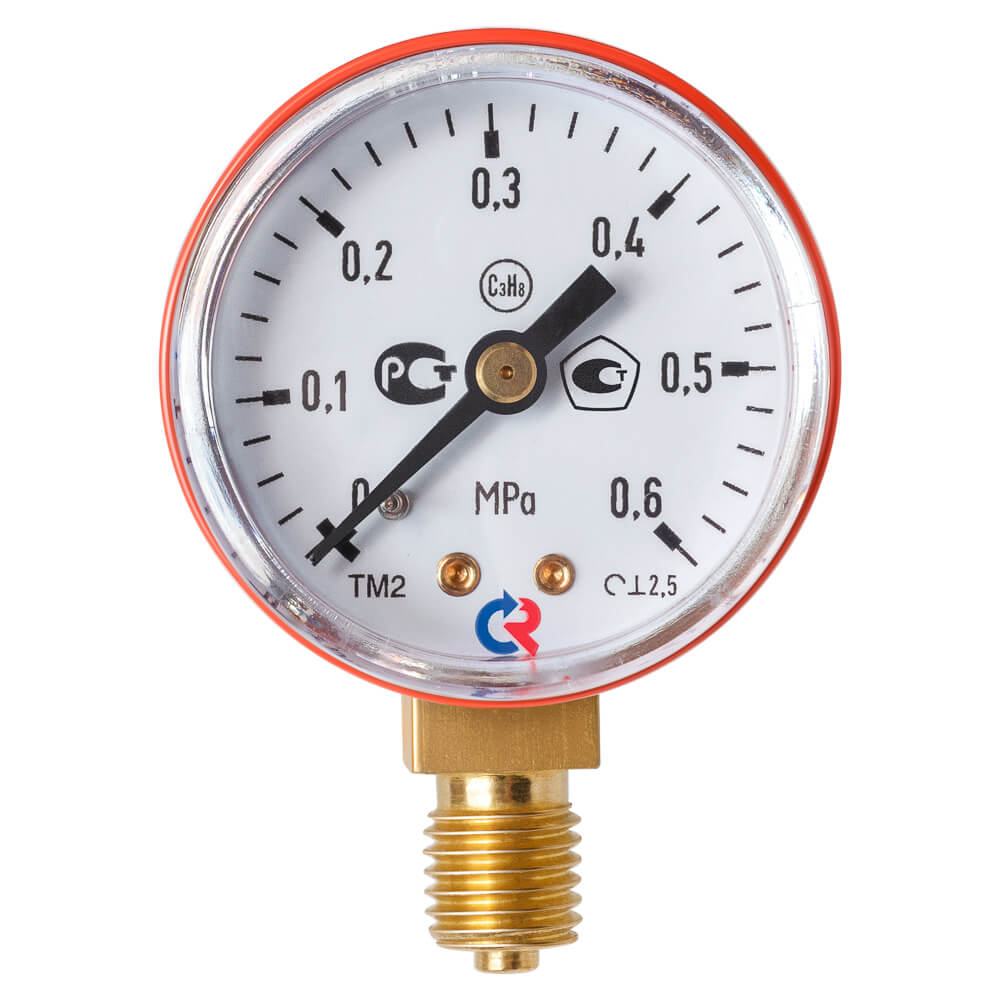 Сварочный манометр для пропана (C3H8) производится с диаметром корпуса 50 мм. Класс точности: 2,5. Корпус манометра для редуктора выполнен из стали. Прибор имеет радиальное присоединение, резьба присоединения М12х1,5.