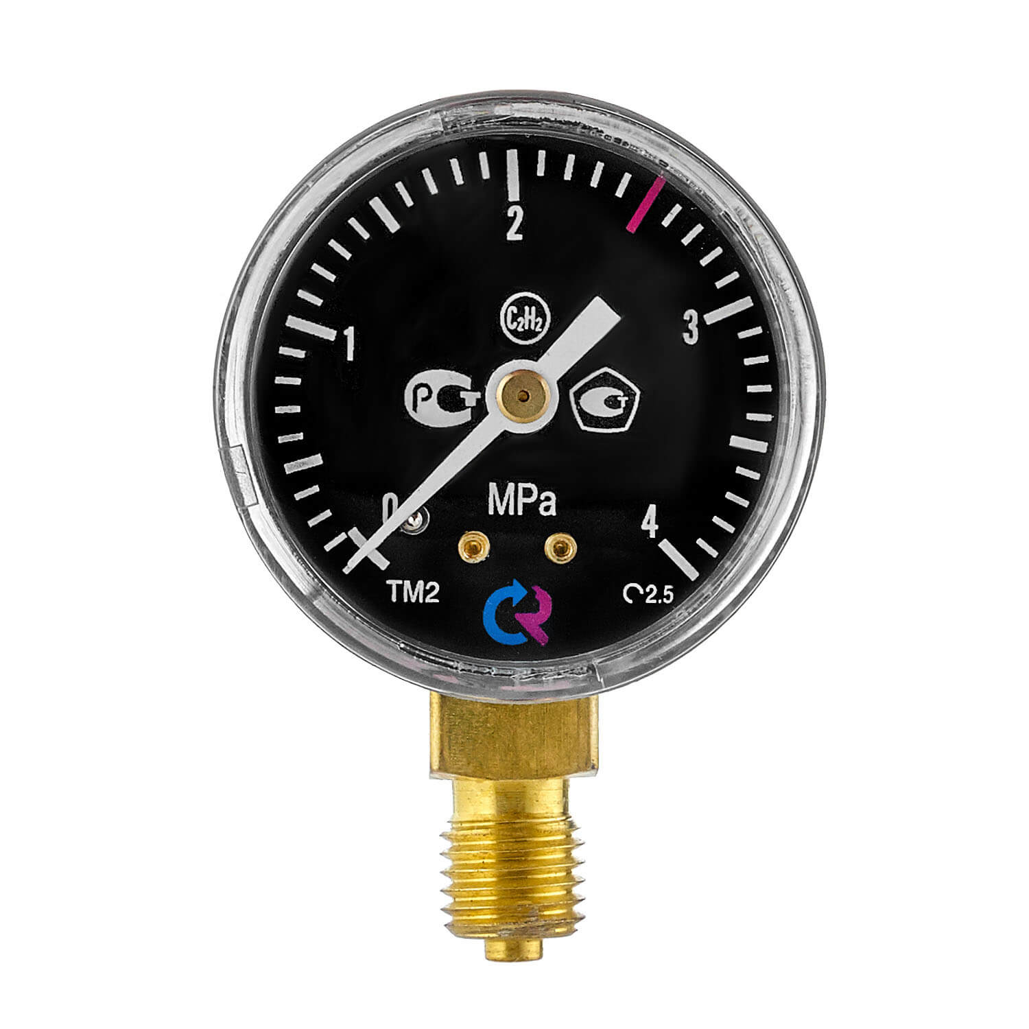 Сварочный манометр для углекислоты (CO₂) производится с диаметром корпуса 50 мм. Класс точности: 2,5. Корпус манометра для редуктора выполнен из стали. Прибор имеет радиальное присоединение, резьба присоединения М12х1,5.